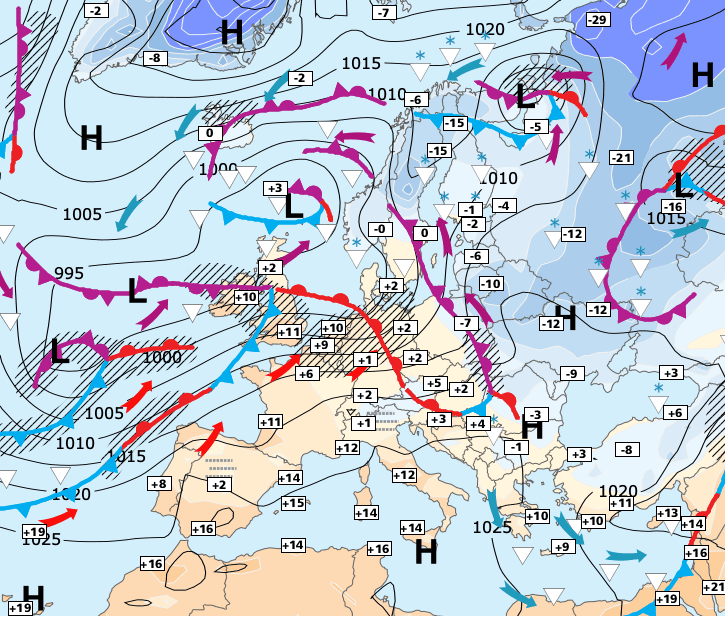 + On surveillera la possibilité de chutes de neige au nord immédiat de la dépression (vers les frontières belges et allemandes).