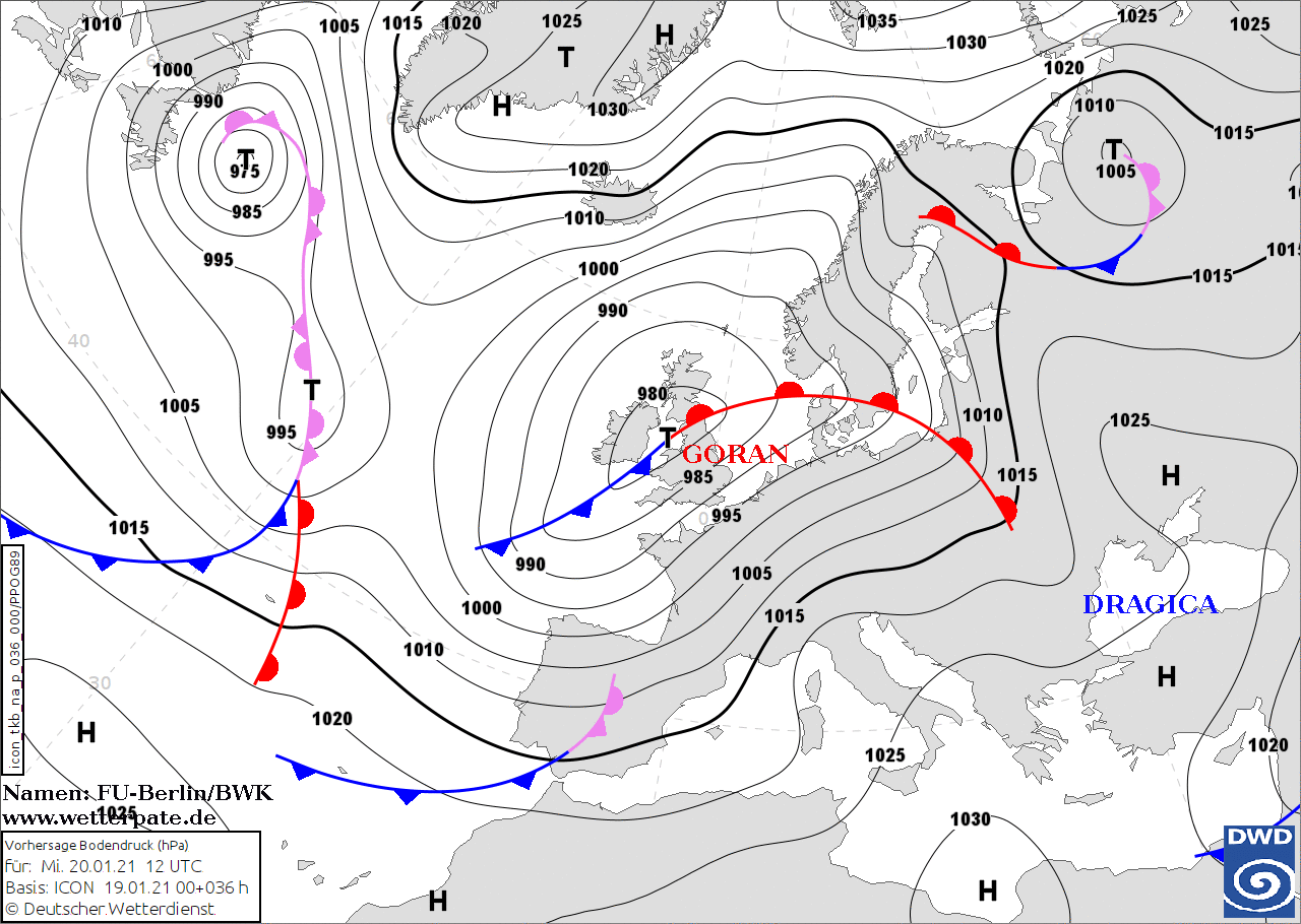 Noms des dépressions et anticyclones prévus pour mercredi 20 janvier 2021 à midi (Berlin)