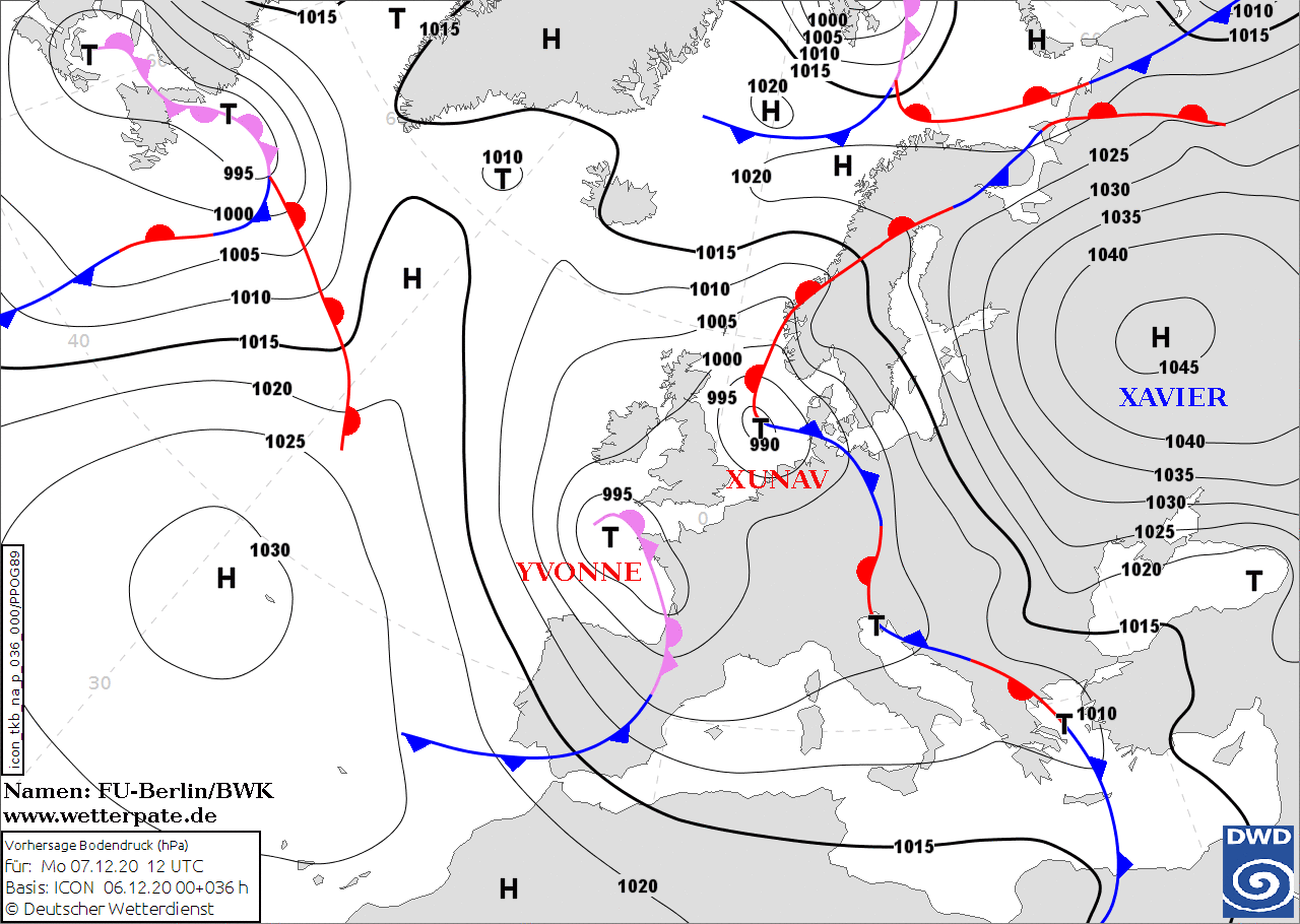 Noms des dépressions et anticyclones prévus pour lundi 7 décembre 2020 à midi (Berlin)