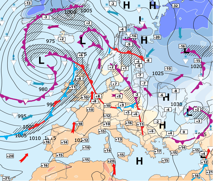 Noms des dépressions et anticyclones prévus pour samedi 20 février 2021 à midi (Berlin)