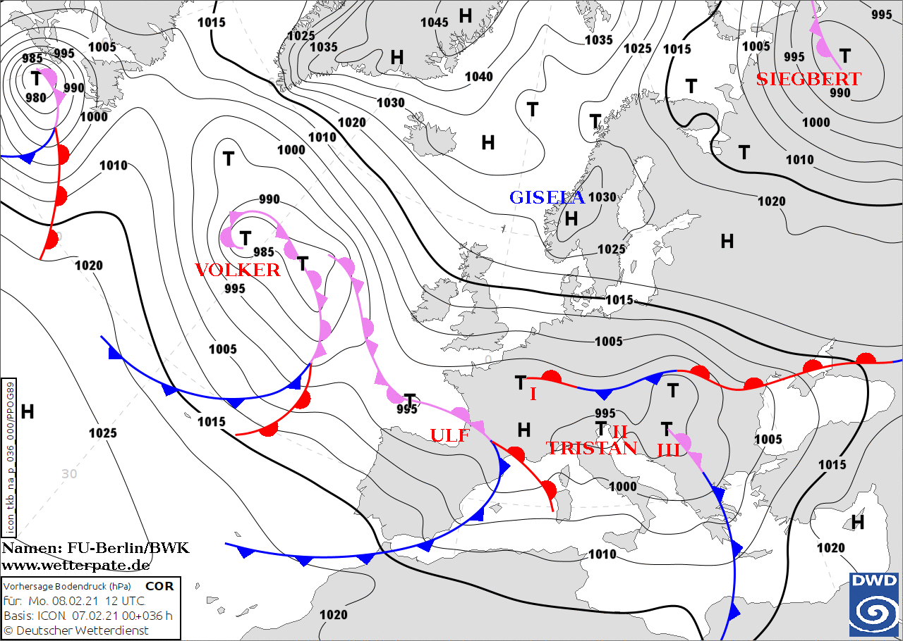 Noms des dépressions et anticyclones prévus pour lundi 8 février 2021 à midi (Berlin)
