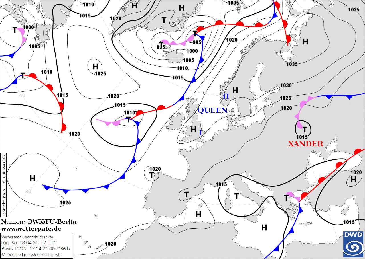 Noms des dépressions et anticyclones prévus pour dimanche 18 avril 2021 à midi (Berlin)
