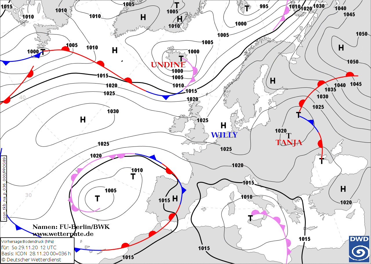 Noms des dépressions et anticyclones prévus pour dimanche 29 novembre 2020 à midi (Berlin)