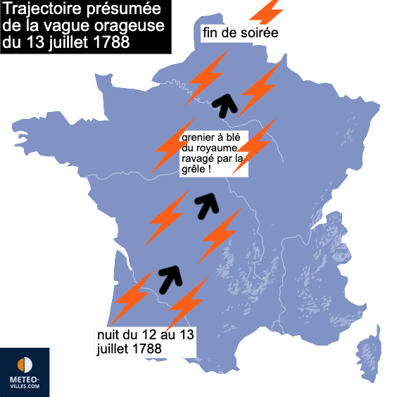 Trajectoire présumée de l'orage sur le Royaume de France entre la nuit du 12 au 13 juillet 1788 (Sud-ouest) et la journée du 13 juillet 1788 entre le Centre et la Belgique).